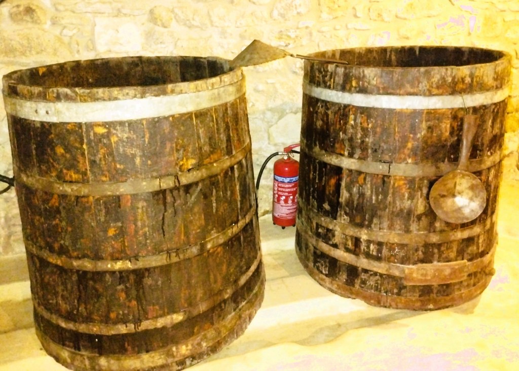 μεγάλα ξύλινα βαρέλια για τον καθαρισμό του λαδιού, όπου παρέμενε το